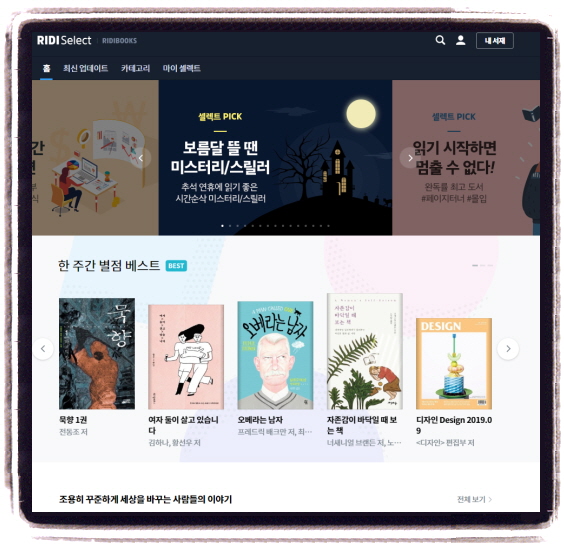 리디북스에 "셀렉트"라는 서비스인데 이것은 한달에 6500원을 내면 10권을 책을 무료로 볼수 있는 구독형 서비스였다. 지금은 무제한 책을 구독이 가능해 더욱 큰 혜택을 누릴수 있다. 나 같이 해외에 머무는 사람들에게는 상당히 좋은 서비스이기도 하다. 물론 모든 책을 다 볼수 있는것은 아니지만 예전에 어중이 떠중이 책들로 서비스하던 이북 시장도 요즘에는 많이 성숙한 느낌이나서 바로 서비스를 구독하기 시작한지 일년이 되어간다.